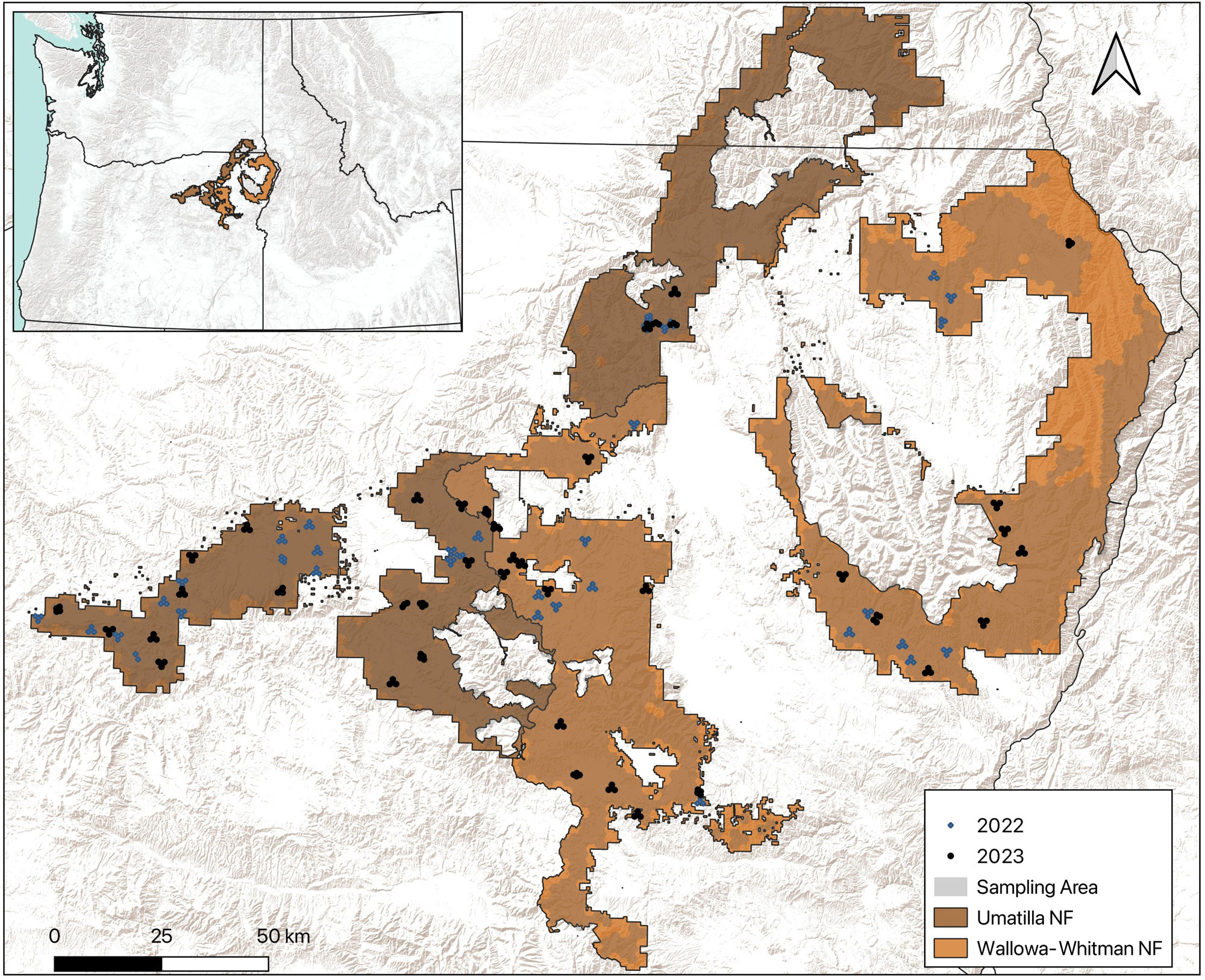 FIG 1: Map of the Umatilla (dark brown) and Wallowa-Whitman (light brown) National Forests. Black circles and blue diamonds indicate locations where recording units were deployed between 1 May and 31 June in 2022 and 2023. Shaded area within each national forest denotes the extent of the sampling area defined by amount of forested habitat and land ownership. Inset map shows the study area in relation to Oregon, Washington, and Idaho.