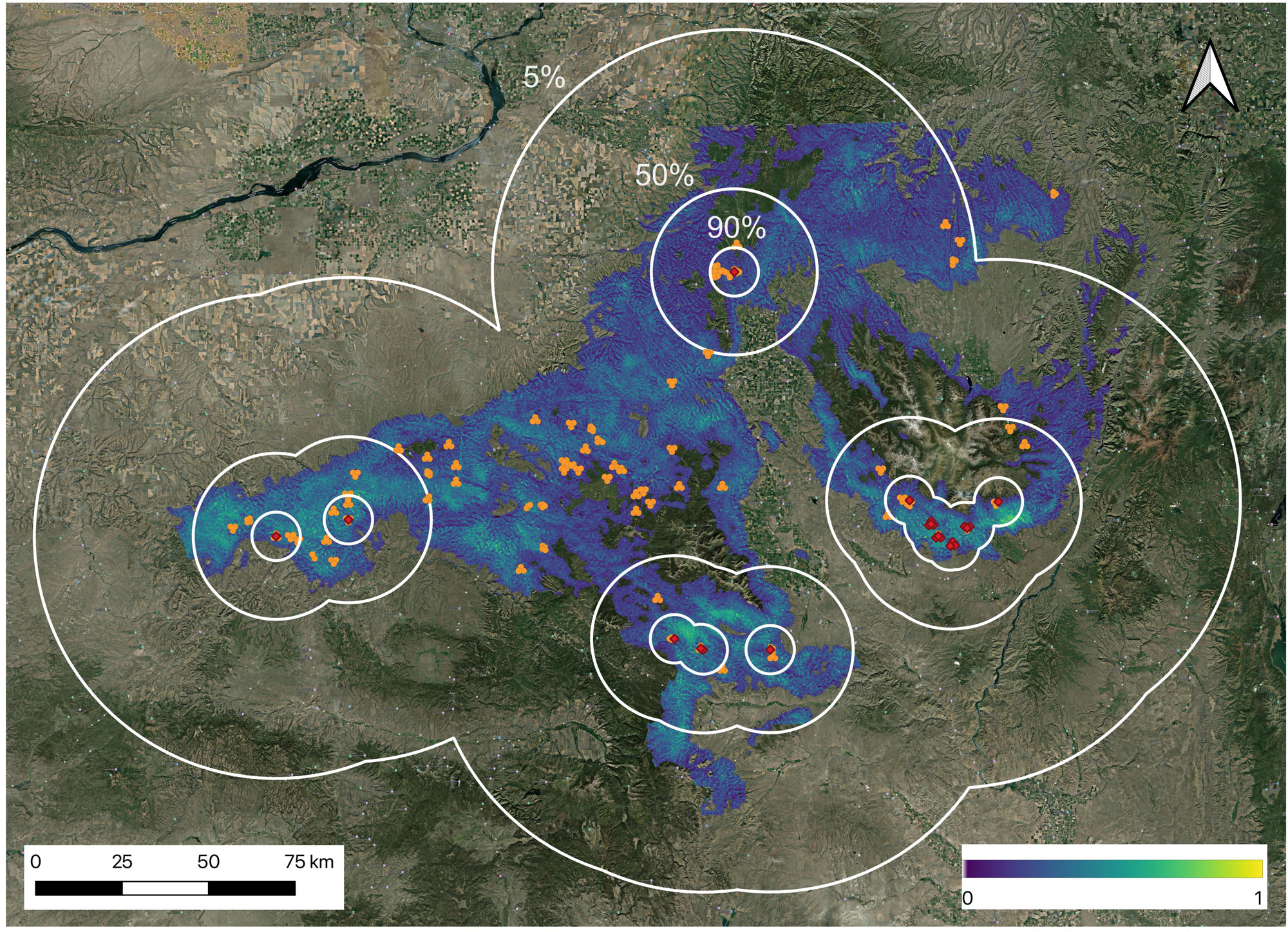 FIG. 3: Potential juvenile White-headed Woodpecker (Leuconotopicus albolarvatus) dispersal distances from areas found to be occupied by White-headed Woodpeckers. Red diamonds indicate stations occupied by White-headed Woodpeckers and orange circles indicate unoccupied stations. Blue to yellow gradient show the Habitat Suitability Index generated by Latif et al. (2015) on National Forest lands. The smallest white buffers indicate the minimum distance 90% of woodpeckers dispersed (i.e., 7 km radius), the middle white buffers indicate the minimum distance 50% of woodpeckers dispersed (i.e., 24km radius), and the largest white buffers show minimum distance 5% of juvenile woodpeckers dispersed (i.e., 70 km radius), as reported by Lorenz et al. (2024).